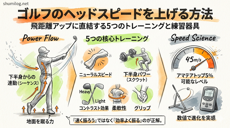 この記事では、ヘッドスピードを効率的に上げるための原理、5つのトレーニング、スイング改善のポイント、そしておすすめの練習器具まで解説します。