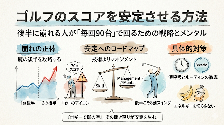 スコアが安定しない原因は「技術」だけじゃない。メンタル・コース戦略・体力配分が複合的に絡んでいる。特に「後半に崩れる」問題は、技術よりもメンタルとマネジメントの比重が大きい。